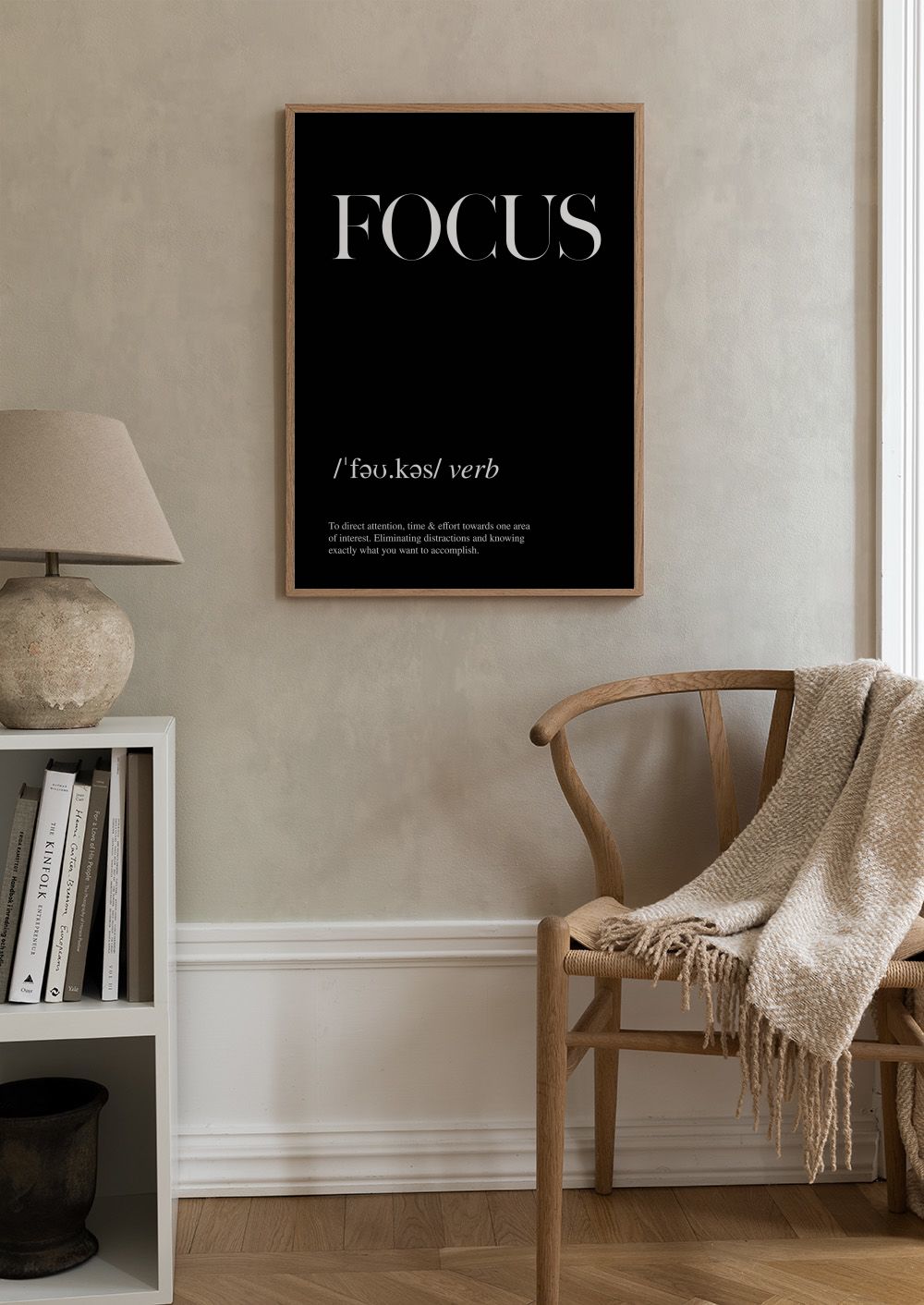 ملصق بخلفية سوداء مع كلمة "FOCUS" بالأبيض. تصميم بسيط يساعدك على التركيز وتحقيق أهدافك.