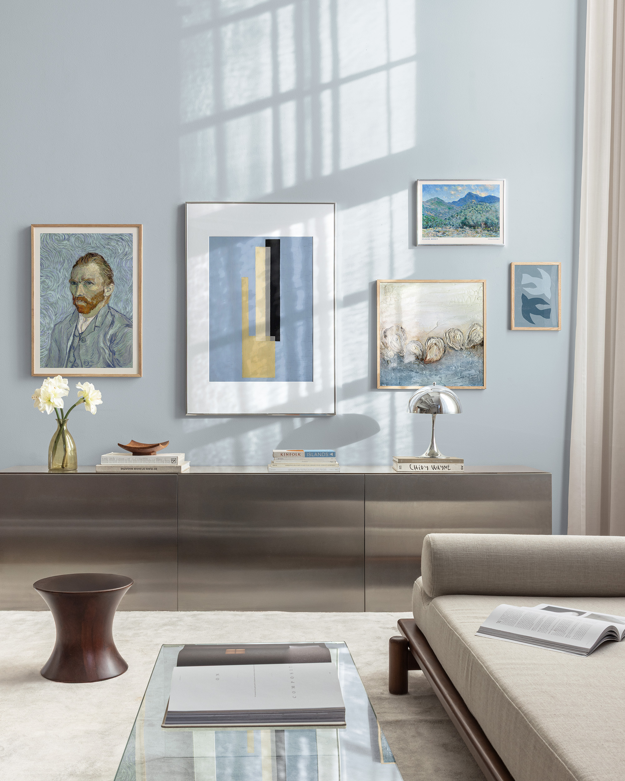Poster of a calm landscape with green hills, blue mountains, and a soft light blue sky with touches of pink and orange. A classic wall art piece in Monet's signature brushstroke style.