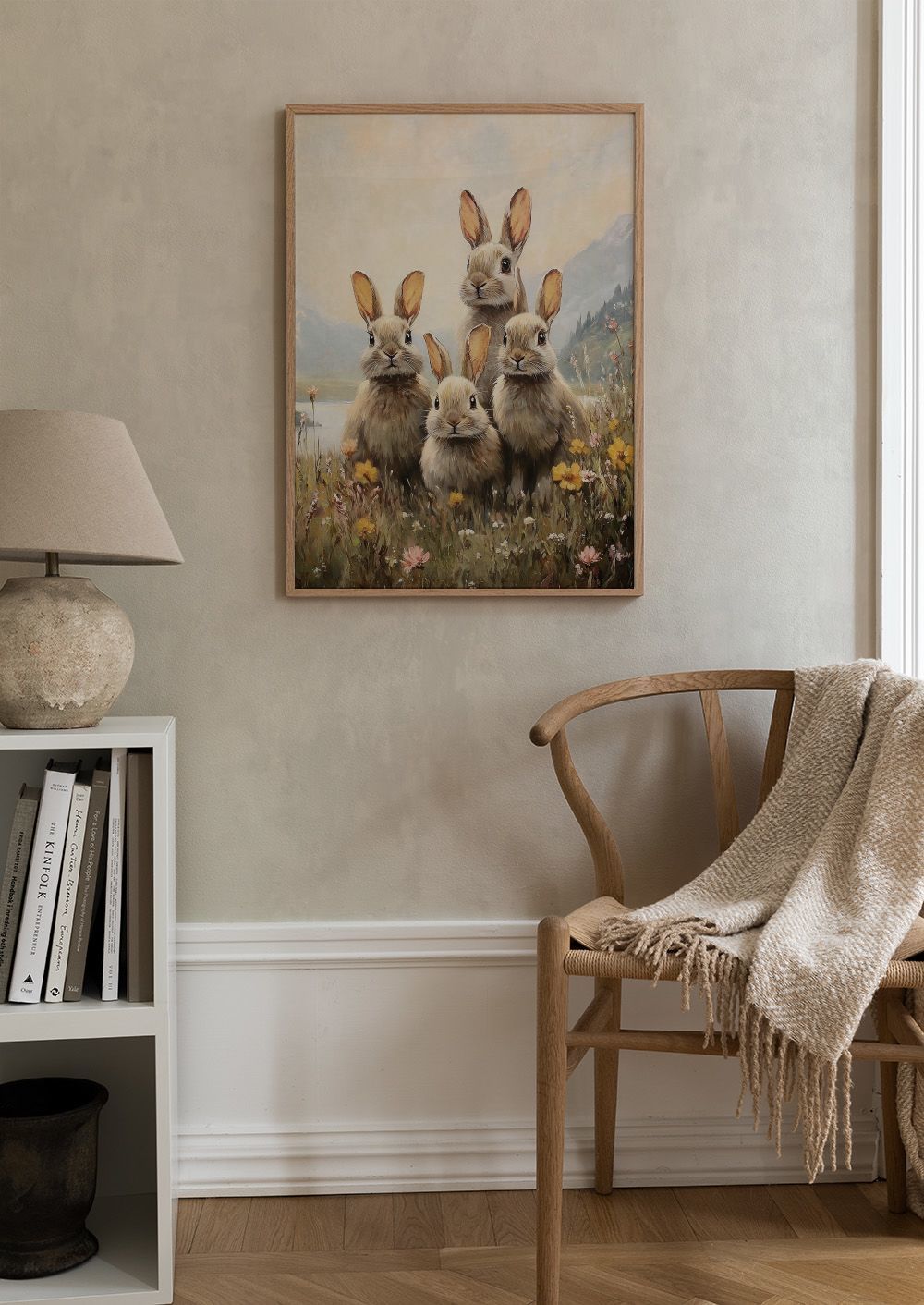 ملصق لأربعة أرانب رقيقة تقف معاً في حقل من الزهور البرية باللون الأصفر والوردي والأبيض. فن جداري مثالي لإحساس هادئ وطبيعي.
