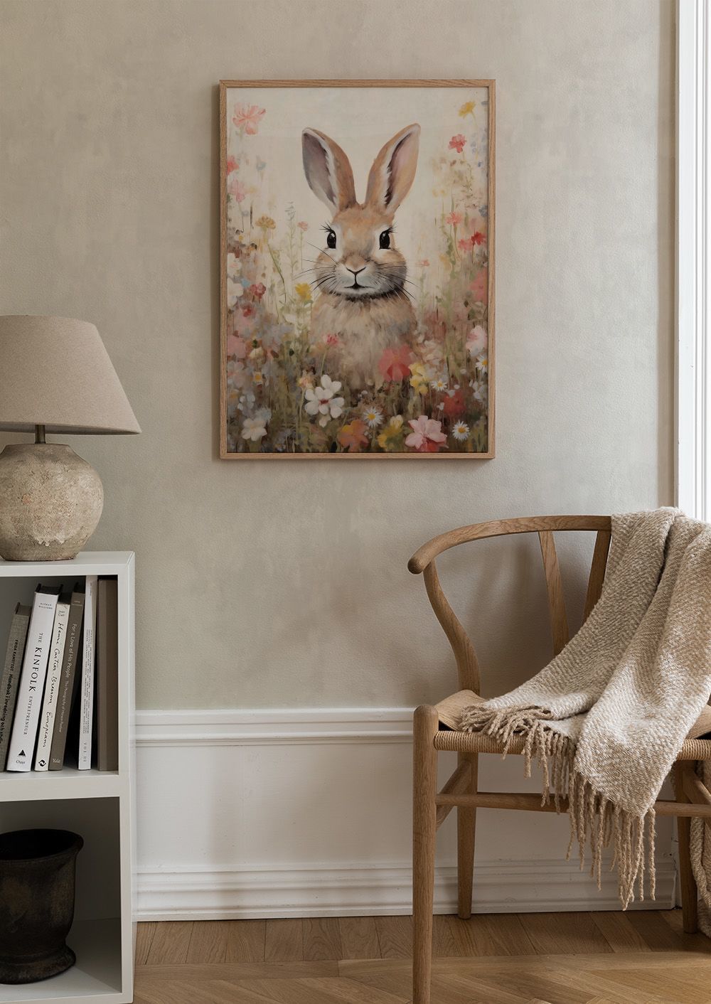 ملصق لأرنب بني لطيف بأذنين كبيرتين يقف بين الزهور البرية الوردية والصفراء والحمراء والبيضاء. قطعة فنية جدارية مثالية لإضفاء البهجة والدفء على منزلك.