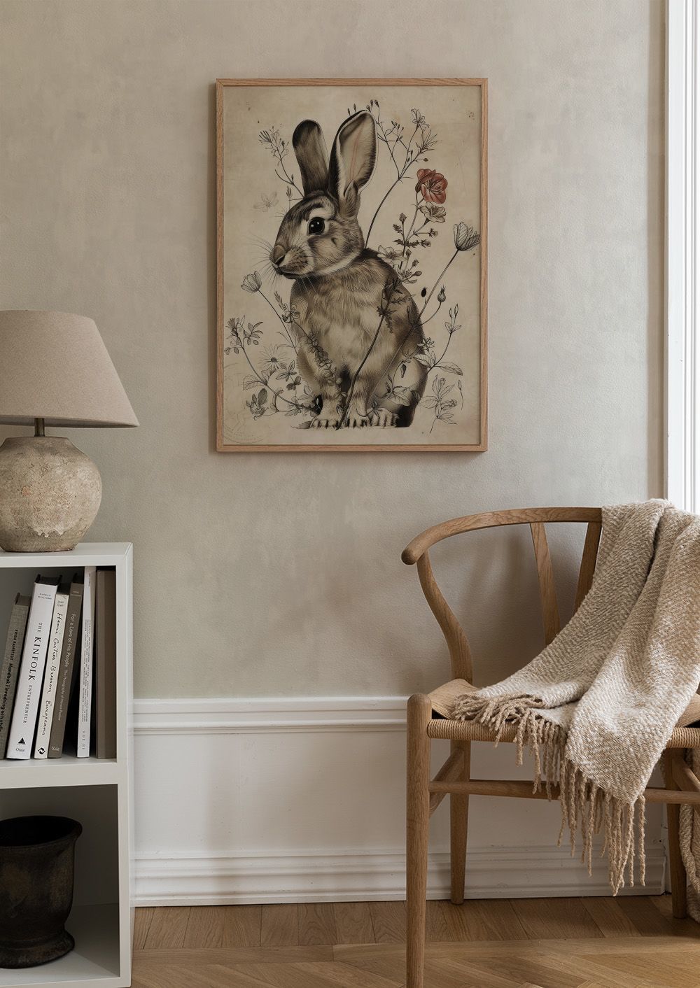 ملصق بأسلوب عتيق لرسم مفصل لأرنب بآذان كبيرة وفراء ناعم. الأرنب محاط بالزهور والنباتات الرقيقة، بما في ذلك زهور الأقحوان وخشخاش أحمر، كل ذلك على خلفية بيج فاتحة.