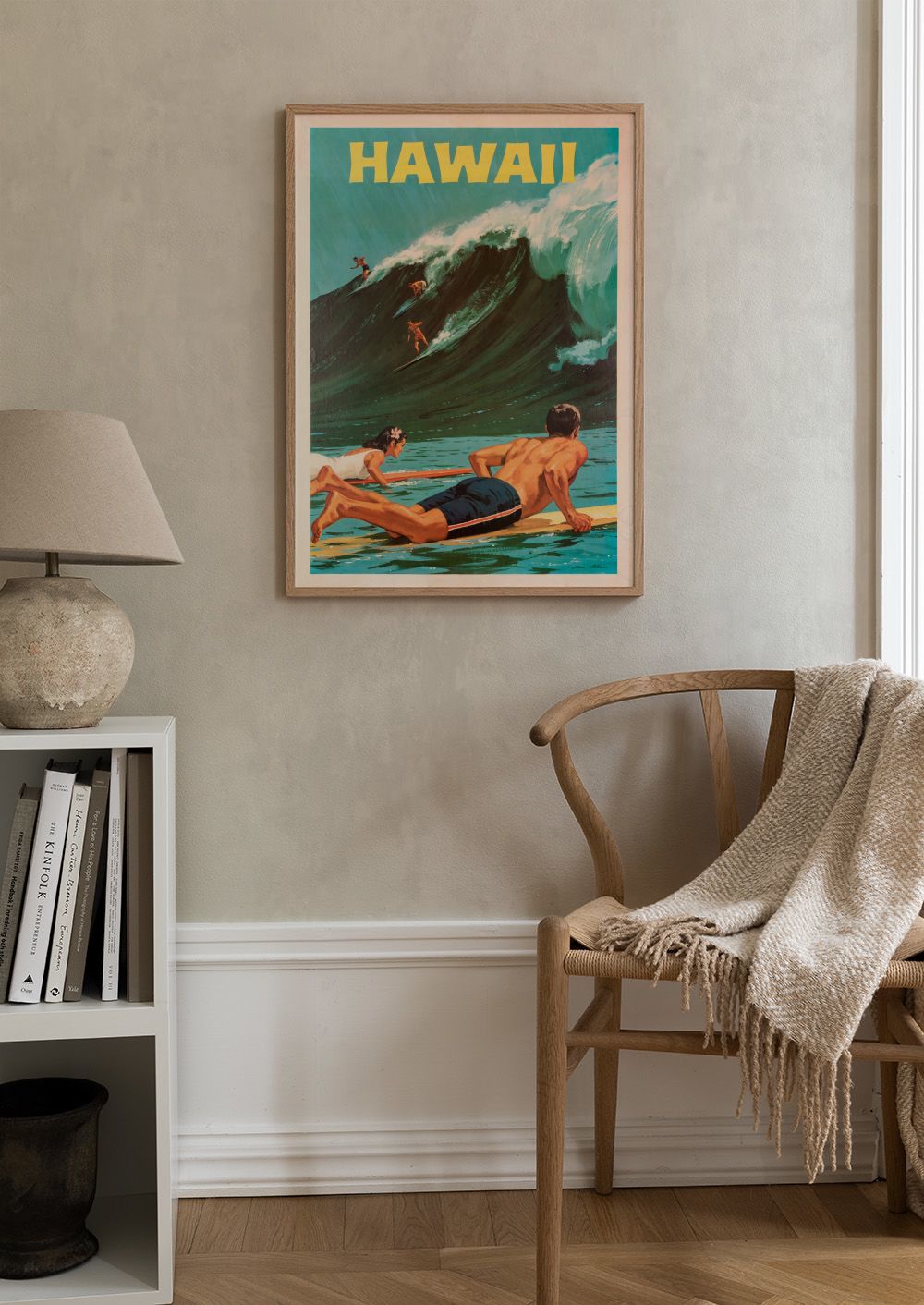 ملصق خمري لهاواي يُظهر أمواج المحيط الزرقاء والخضراء مع راكبي الأمواج. الألوان البرتقالية والفيروزية تضيف جمالاً استوائياً للتصميم.